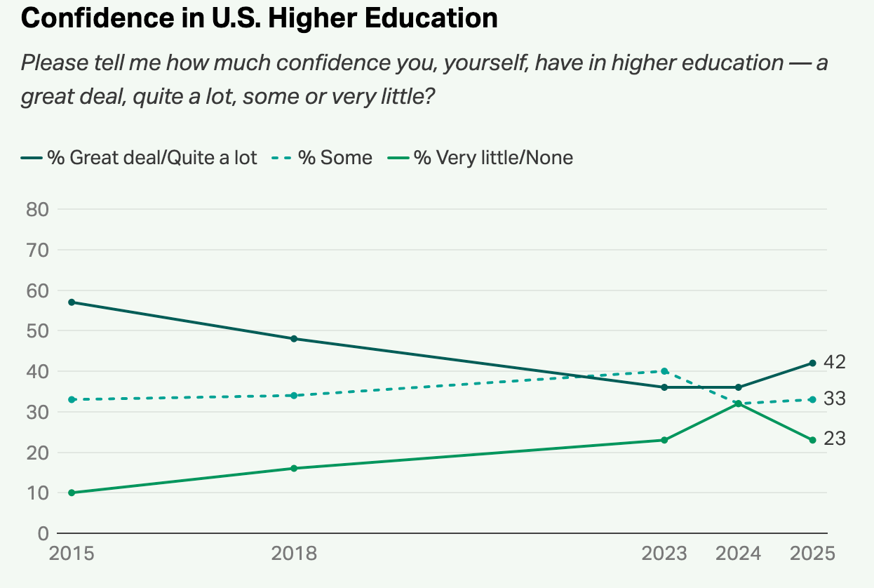 In mid-2025, Gallup reported the first noticeable uptick after a decade of decline, finding that 42% of Americans now say they have “a great deal” or “quite a lot” of confidence in higher education, up from around 36% in previous years, but the general trend has been downward. Democrats are significantly more likely to express confidence than Republicans.